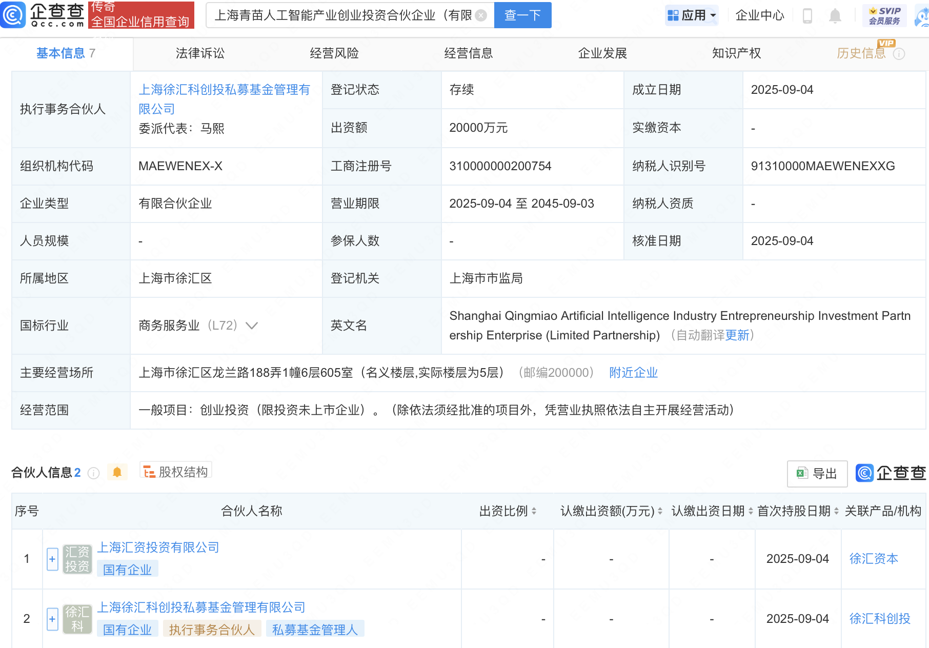 近日,上海青苗人工智能产业创业投资合伙企业(有限合伙)成立,出资额2亿元,经营范围包含:创业投资(限投资未上市企业)。企查查股权穿透显示,该企业由上海汇资投资有限公司等共同出资。